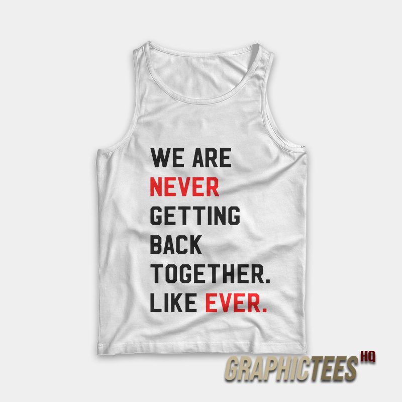 We Are Never Getting Back Together Like Ever Tank Top is made from the premium quality cotton. So, get it now with the best price for any size (S, M, L, XL, 2XL). Further, we only use a high-quality print for a high-end finish. We also guarantee your satisfaction with this durable print that will not fade. So, this tank top really suits you to stay awesome in any way.